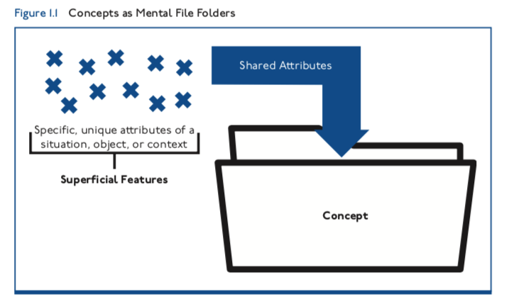A picture of topics with shared attributes being put into a file folder with the word concepts on it. Taken with permission from Learning that Transfers